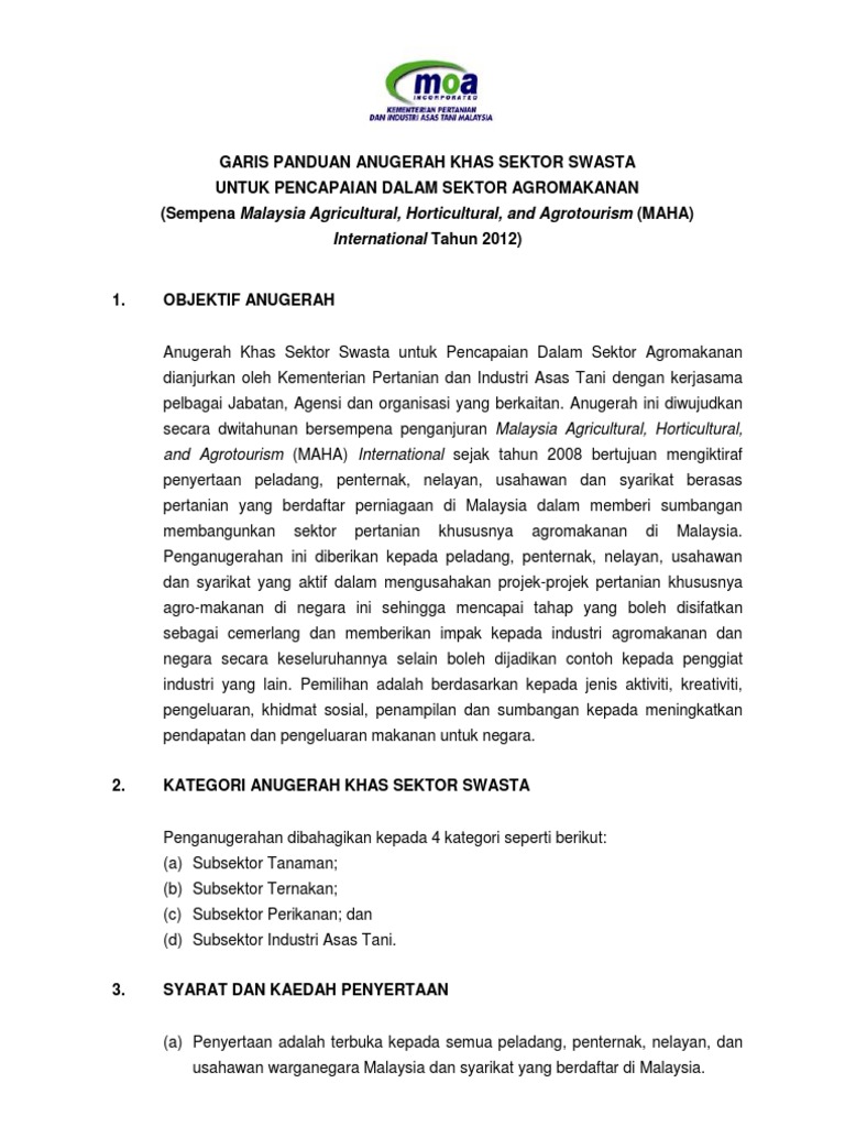Garis Panduan Anugerah Khas Sektor Swasta Untuk Pencapaian Dalam Sektor Agromakanan Sempena Malaysia Agricultural Horticultural And Agrotourism Maha International Tahun 2012