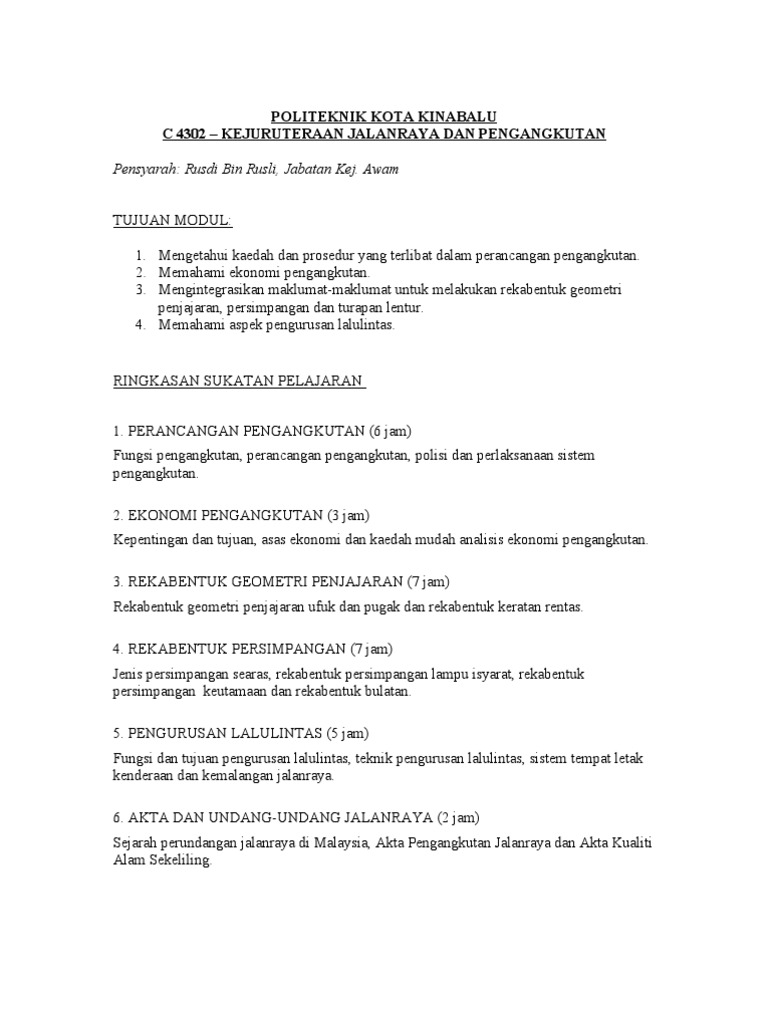 Pensyarah Rusdi Bin Rusli Jabatan Kej Awam Politeknik Kota Kinabalu C 4302 Kejuruteraan Jalanraya Dan Pengangkutan
