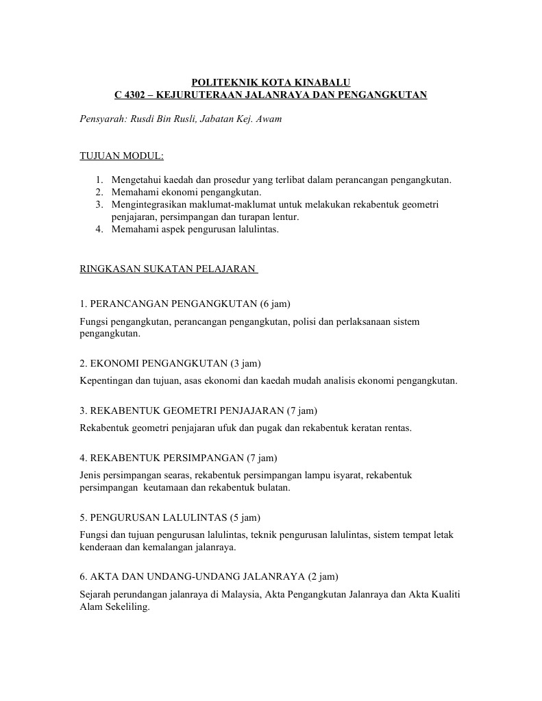 Politeknik Kota Kinabalu C 4302 Kejuruteraan Jalanraya Dan Pengangkutan Pensyarah