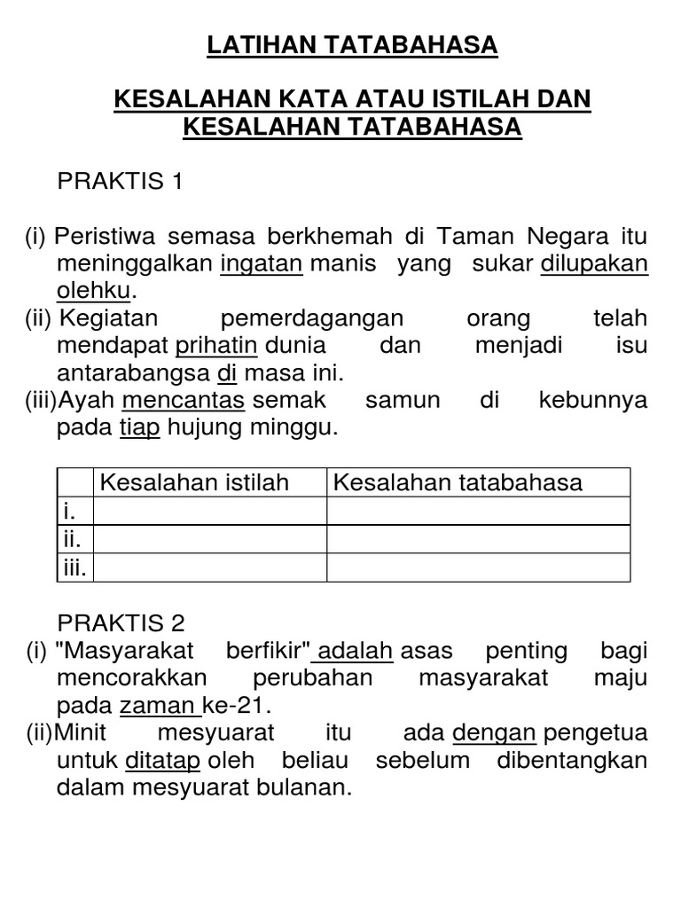 Latihan Tatabahas1 Docx Latihan Tatabahasa Kesalahan Kata Atau Istilah Dan Kesalahan Tatabahasa Praktis 1 I Peristiwa Semasa Berkhemah Di Taman Negara Course Hero