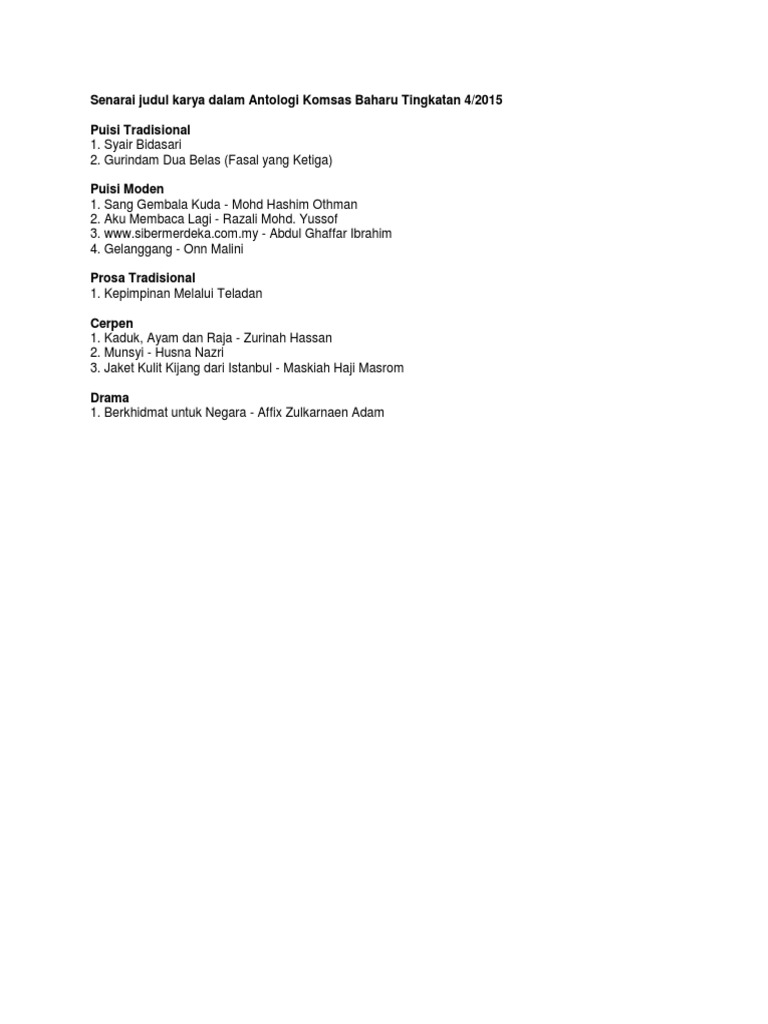 Senarai Judul Karya Dalam Antologi Komsas Baharu Tingkatan 4