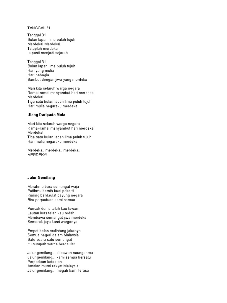 Lirik Lagu Jalur Gemilang Merahmu Bara Semanagat Waja Putihmu Bersih Budi Pekerti Kuning Berdaulat Paying