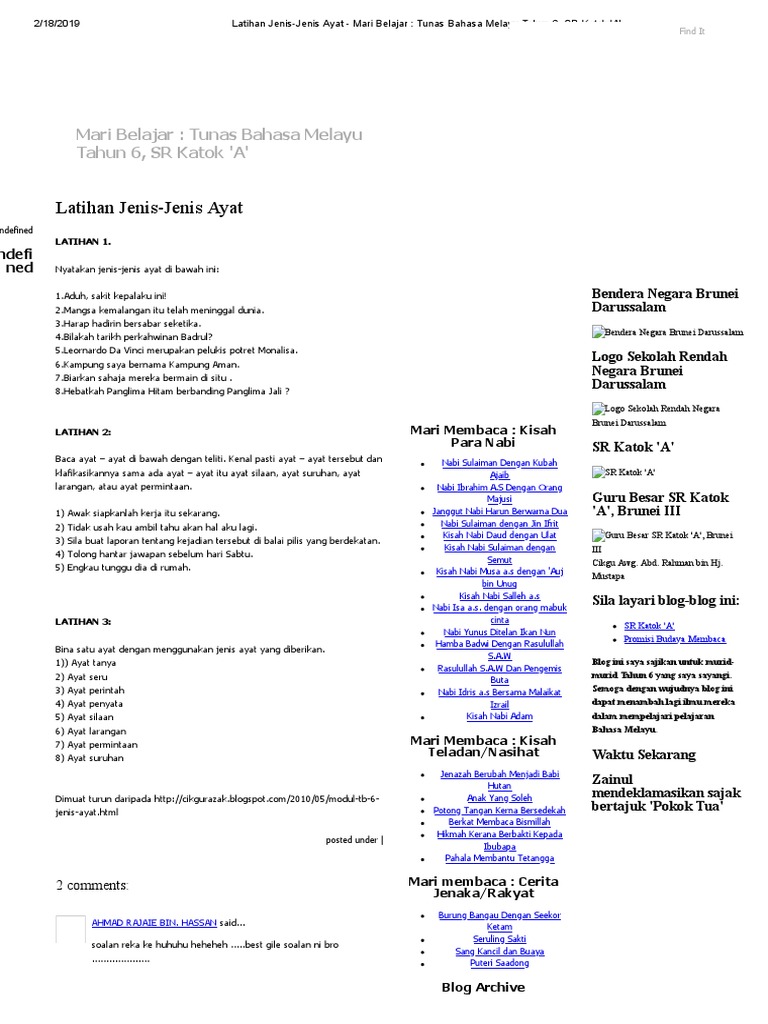 Latihan Jenis Jenis Ayat Mari Belajar Tunas Bahasa Melayu Tahun 6 Sr Katok A