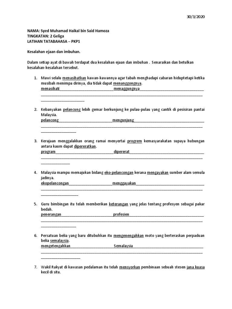 Nama Syed Muhamad Haikal Bin Said Hamoza Tingkatan 2 Geliga Latihan Tatabahasa Pkp1 Kesalahan Ejaan Dan Imbuhan
