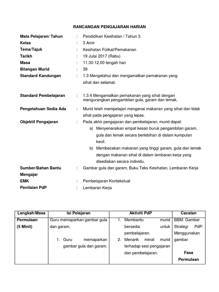 Rph Contoh Pendidikan Jasmani Dan Kesihatan Docx
