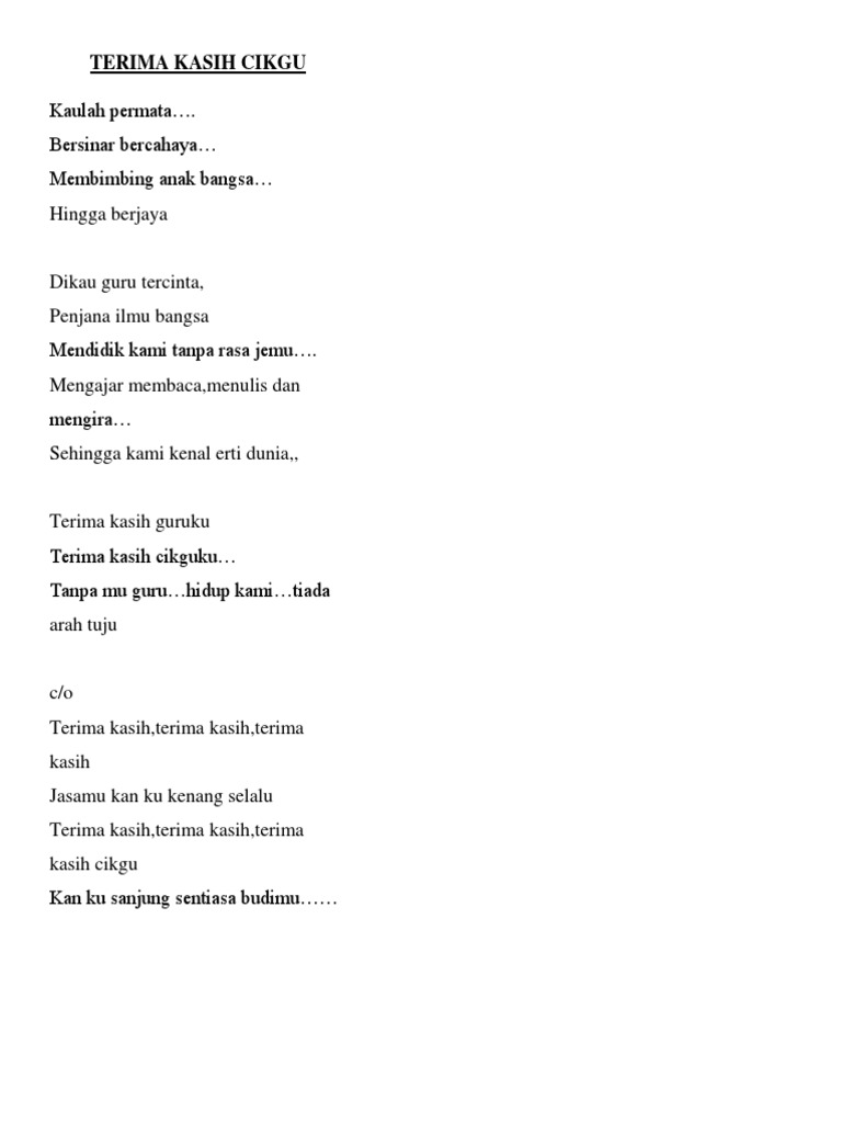 Lirik Terima Kasih Cikgu Lagu Kami Guru Malaysia Docx