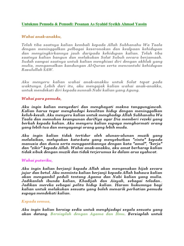 Untukmu Pemuda Pemudi Pesanan As Syahid Syeikh Ahmad Yassin