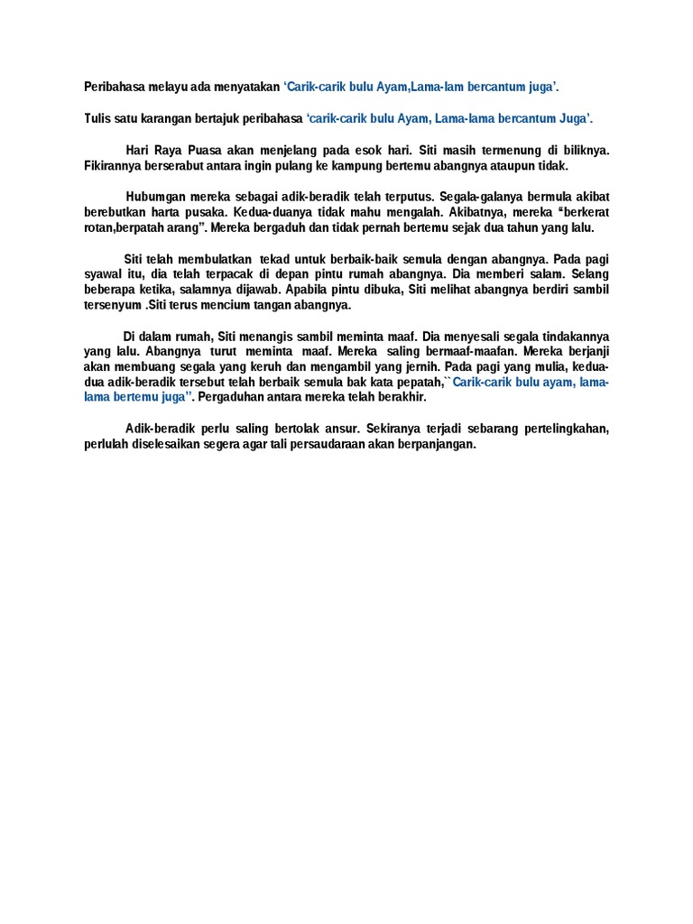 Maksud Peribahasa Carik Carik Bulu Ayam Lama Lama Bercantum Juga