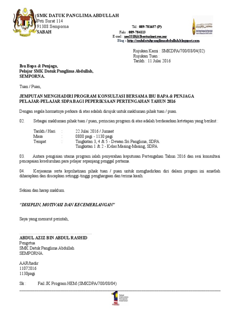 Contoh Surat Jemputan Ibu Bapa Ke Program Sekolah
