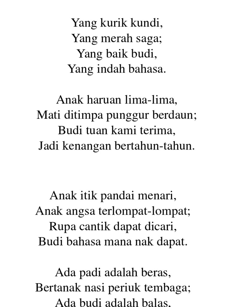 Pulau daik banyak kelapa pulau karimon banyak pegaga. Pulau pandan jauh ke tengah gunung daik bercabang dua. Tenang tenang air di laut sampan kolek mudik ke tanjung. Rangkap 3 orang yang tidak berbudi bahasa akan dipandang hina.