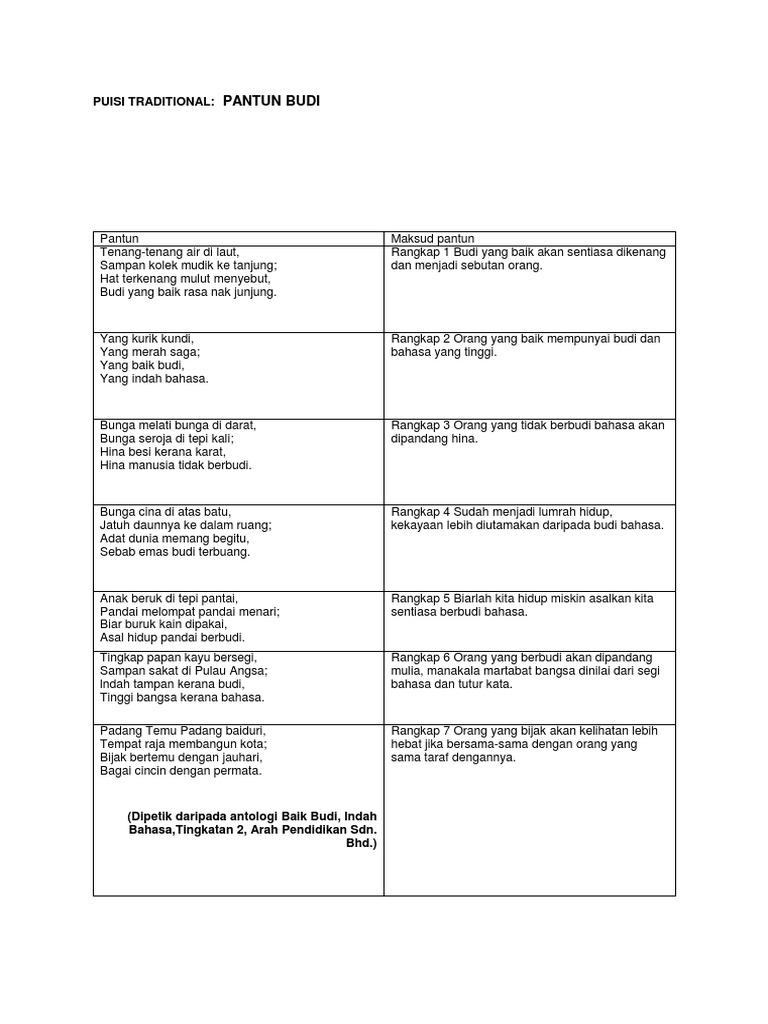 Pantun baik budi indah bahasa. Maksud tema persoalan gaya bahasa bentuk dan nilai pengajaran. Buat jahat jangan sekali. Walaupun jasad hancur dikandung tanah budi yang baik kan tetap dikenang selamanya. Pucuk palas si daun palas tetak mari beranti ranti.
