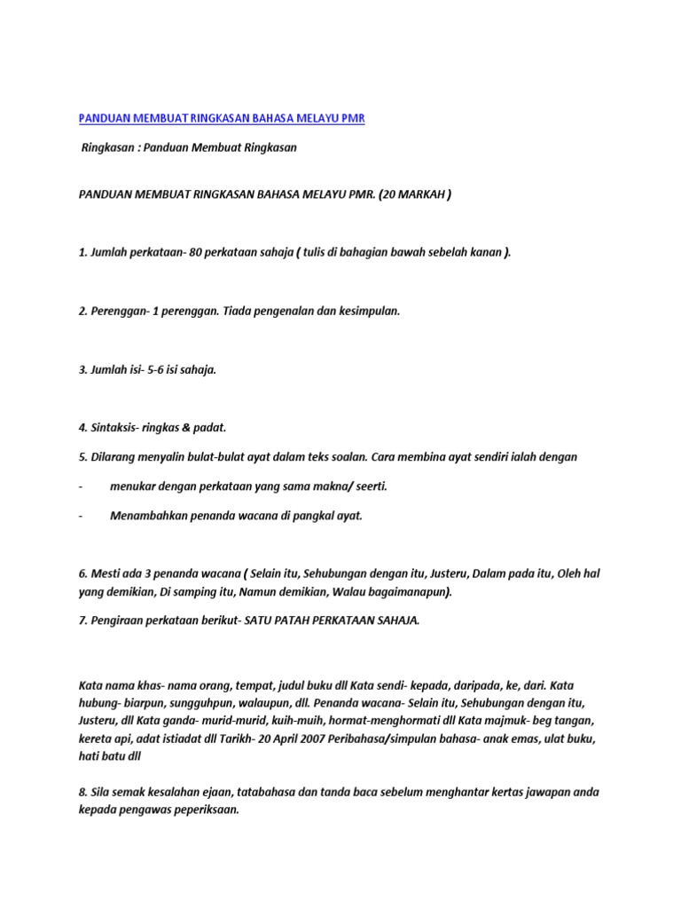 Panduan Membuat Ringkasan Bahasa Melayu Pmr