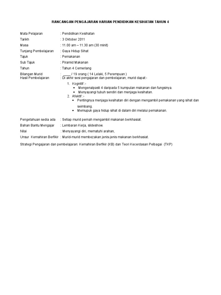 68267525 Rancangan Pengajaran Harian Pendidikan Kesihatan Tahun 4 Docx