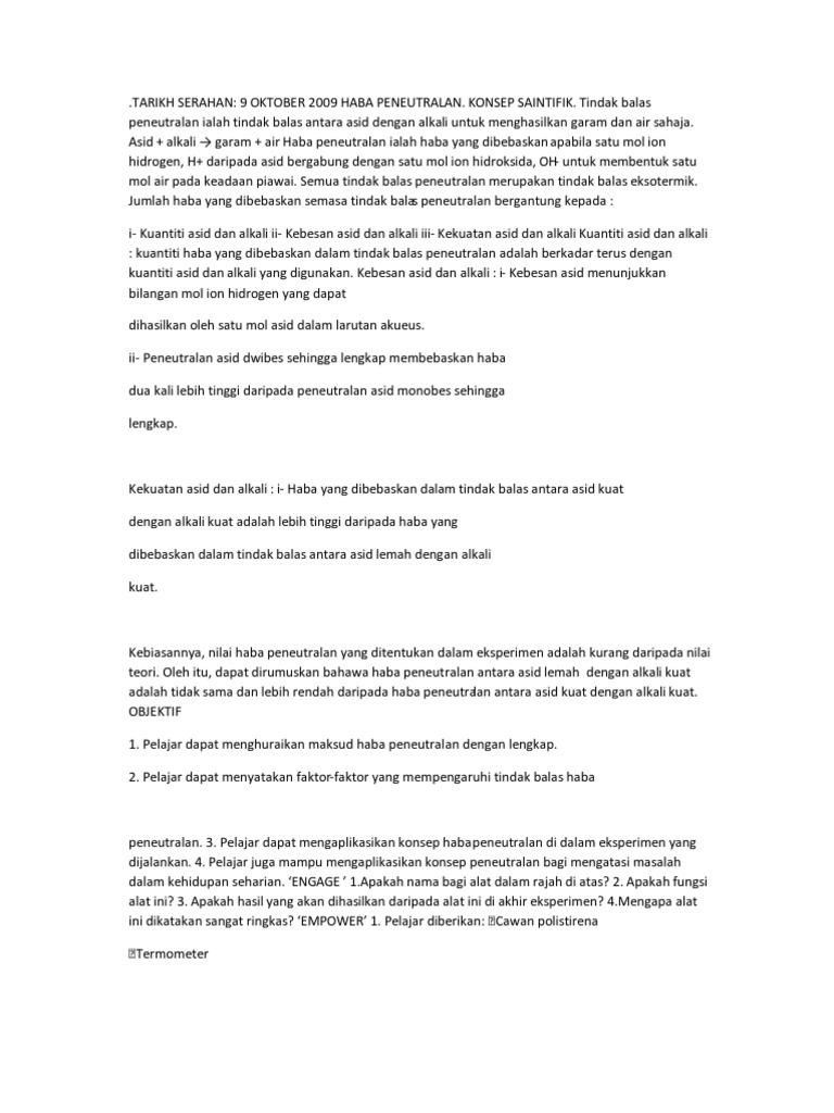 Peneutralan adalah tindakbalas antara asid dan alkali yang menghasilkan garam dan air. Tindak balas ini disebut peneutralan. Sifat kuantitatif reaksi neutralisasi adalah yang paling mudah dinyatakan dalam segi kepekatan asid dan alkali. Asid dan alkali merupakan larutan hanya menunjukkan sifat masing masing apabila dilarutkan dalam air kertas ph digunakan untuk menguji sama ada sesuatu bahan slideshare uses cookies to improve functionality and performance and to provide you with relevant advertising.