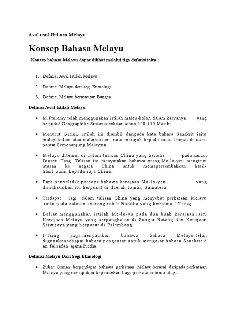 Pengenalan asal usul bahasa melayu. 1 1 asal usul bahasa melayu definisi awal istilah melayu m. Sejarah dan perkembangan bahasa melayu1 1 asal usul bahasa melayu1 2 salasilah bahasa melayu1 3 bahasa melayu kuno1 4 batu bersurat kurun ke 7 dan ke 141 5 bahasa melayu klasik1 6 unsur asing 2. Dalam modul ini topik 1 dan topik 2 merupakan imbasan kembali sejarah awal secara ringkas. Asal usul bangsa melayu sehingga kini masih kabur tetapi beberapa sarjana eropah seperti hendrik kern belanda dan robert von heine geldern austria telah melakukan penyelidikan secara kasar tentang latar belakang dan pergerakan masyarakat melayu kuno.
