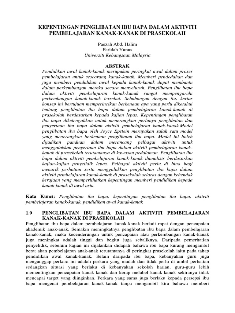 Jurnal Penglibatan Ibu Bapa Dalam Pendidikan Awal Kanak Kanak Pdf Telegraph