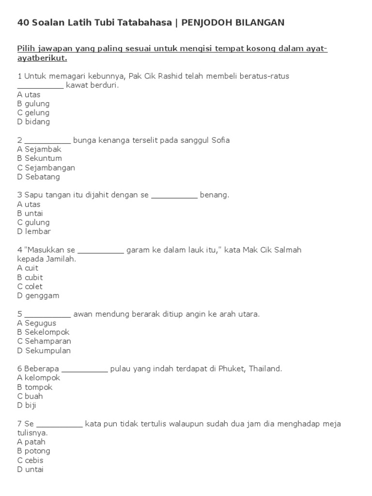 3 encik samad mempunyai se tanah. Jika tak silap saya penggunaan penjodoh bilangan untuk jam adalah seutas bukannya sepasang. Penjodoh bilangan 3 di bawah. Gula gula kepada adiknya cucuk karim membungkus 15.